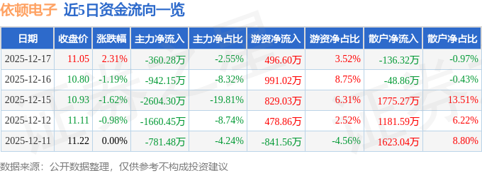 证券之星消息,截至2025年12月17日收盘,依顿电子(603328)报收于11.05元,上涨2.31%,换手率1.3%,成交量12.96万手,成交额1.41亿元。