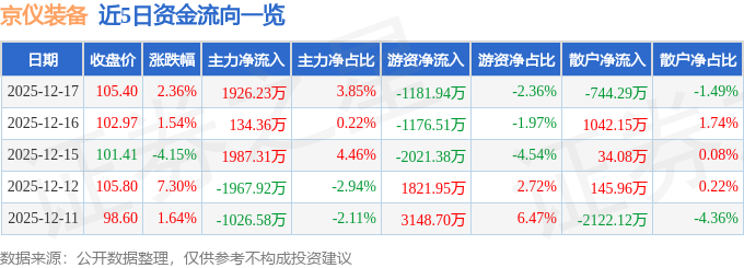 证券之星消息,截至2025年12月17日收盘,京仪装备(688652)报收于105.4元,上涨2.36%,换手率4.05%,成交量4.89万手,成交额5.0亿元。