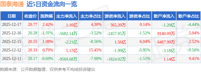 证券之星消息,截至2025年12月17日收盘,国泰海通(601211)报收于20.77元,上涨2.42%,换手率0.97%,成交量131.08万手,成交额27.03亿元。