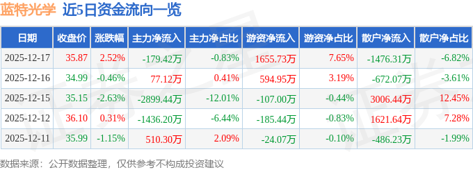 证券之星消息,截至2025年12月17日收盘,蓝特光学(688127)报收于35.87元,上涨2.52%,换手率1.5%,成交量6.08万手,成交额2.16亿元。