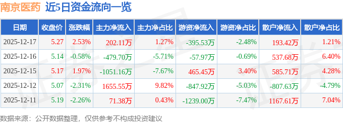证券之星消息,截至2025年12月17日收盘,南京医药(600713)报收于5.27元,上涨2.53%,换手率2.36%,成交量30.32万手,成交额1.59亿元。