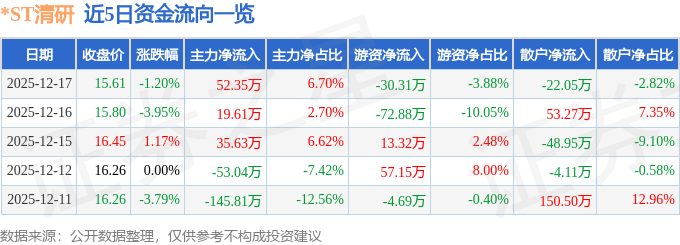 证券之星消息,截至2025年12月17日收盘,*ST清研(301288)报收于15.61元,下跌1.2%,换手率0.65%,成交量5050.0手,成交额781.1万元。