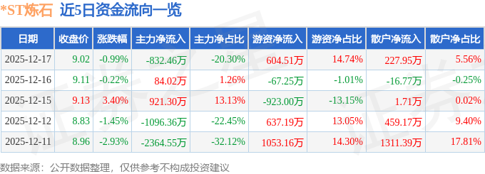 证券之星消息,截至2025年12月17日收盘,*ST炼石(000697)报收于9.02元,下跌0.99%,换手率0.7%,成交量4.54万手,成交额4101.29万元。