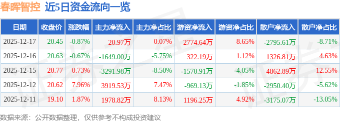 证券之星消息,截至2025年12月17日收盘,春晖智控(300943)报收于20.45元,下跌0.87%,换手率11.66%,成交量15.67万手,成交额3.21亿元。