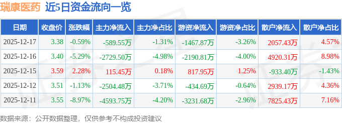 证券之星消息,截至2025年12月17日收盘,瑞康医药(002589)报收于3.38元,下跌0.59%,换手率9.73%,成交量132.82万手,成交额4.5亿元。