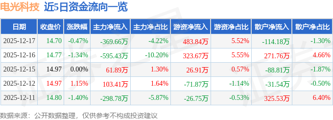 证券之星消息,截至2025年12月17日收盘,电光科技(002730)报收于14.7元,下跌0.47%,换手率1.73%,成交量5.99万手,成交额8761.1万元。