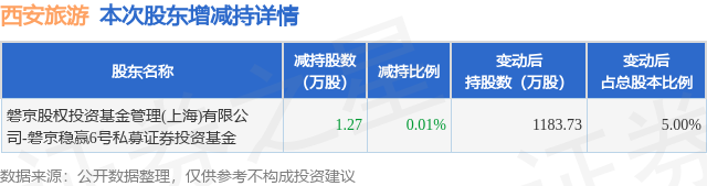 证券之星消息,12月17日西安旅游发布公告《西安旅游:关于持股5%以上股东权益变动的提示性公告》,其股东磐京股权投资基金管理(上海)有限公司-磐京稳赢6号私募证券投资基金于2025年12月16日合计减持1.27万股,占公司目前总股本的0.0054%,变动期间该股股价下跌0.49%,截止12月16日收盘报12.27元。