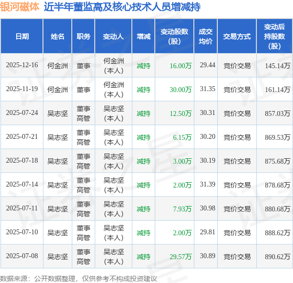 银河磁体近半年内的董监高及核心技术人员增减持详情如下: