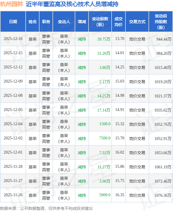 杭州园林近半年内的董监高及核心技术人员增减持详情如下: