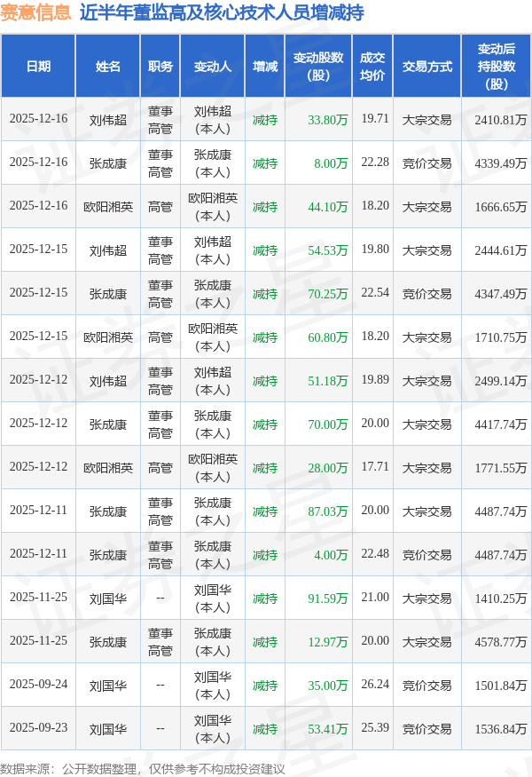 赛意信息近半年内的董监高及核心技术人员增减持详情如下: