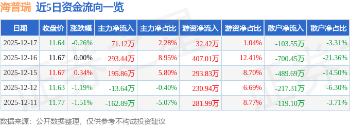 证券之星消息,截至2025年12月17日收盘,海普瑞(002399)报收于11.64元,下跌0.26%,换手率0.22%,成交量2.69万手,成交额3126.21万元。