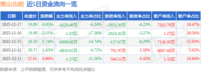 证券之星消息,截至2025年12月17日收盘,常山北明(000158)报收于19.89元,下跌0.05%,换手率2.22%,成交量35.17万手,成交额6.94亿元。