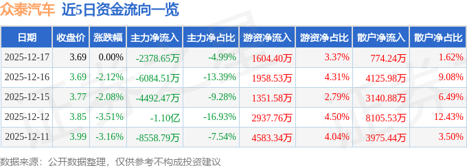 证券之星消息,截至2025年12月17日收盘,众泰汽车(000980)报收于3.69元,上涨0.0%,换手率2.55%,成交量128.34万手,成交额4.77亿元。