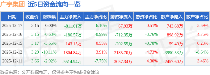 证券之星消息,截至2025年12月17日收盘,广宇集团(002133)报收于3.15元,上涨0.0%,换手率5.53%,成交量42.57万手,成交额1.33亿元。