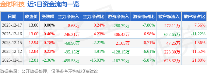 证券之星消息,截至2025年12月17日收盘,金时科技(002951)报收于13.0元,上涨0.0%,换手率0.7%,成交量2.8万手,成交额3598.81万元。