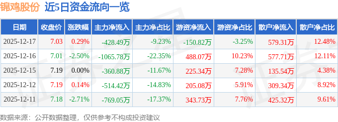 证券之星消息,截至2025年12月17日收盘,锦鸡股份(300798)报收于7.03元,上涨0.29%,换手率1.79%,成交量6.66万手,成交额4640.61万元。