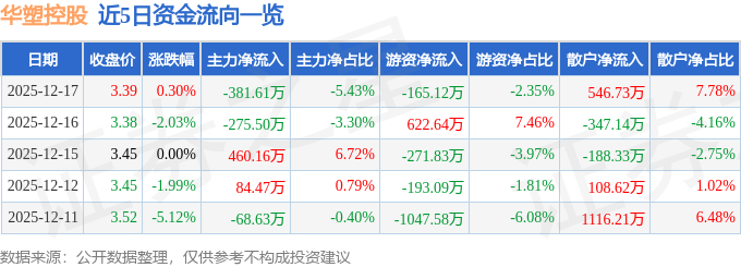 证券之星消息,截至2025年12月17日收盘,华塑控股(000509)报收于3.39元,上涨0.3%,换手率1.94%,成交量20.87万手,成交额7026.91万元。
