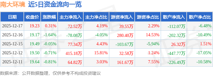 证券之星消息,截至2025年12月17日收盘,南大环境(300864)报收于19.23元,上涨0.31%,换手率0.57%,成交量9026.0手,成交额1729.73万元。