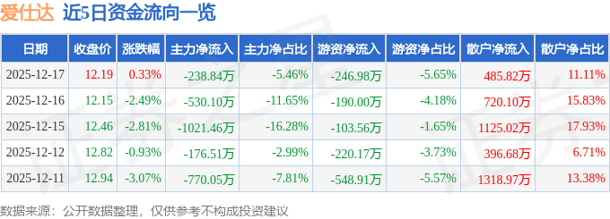 12月17日的资金流向数据方面,主力资金净流出238.84万元,占总成交额5.46%,游资资金净流出246.98万元,占总成交额5.65%,散户资金净流入485.82万元,占总成交额11.11%。