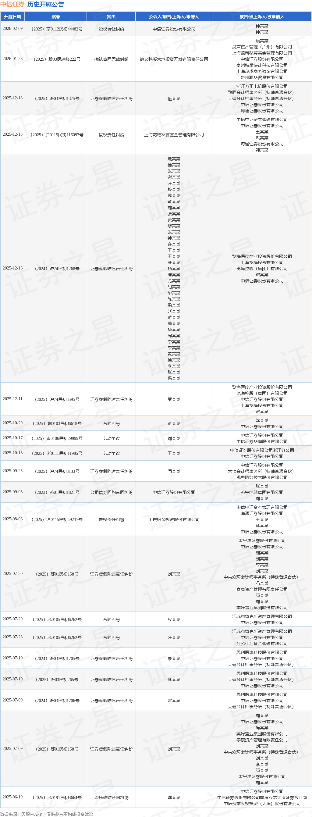 案号:(2025)浙03民初1375号根据统计,近一年内以中信证券股份有限公司为当事人的历史开庭公告有40则,其中案由为“证券虚假陈述责任纠纷”的公告以16则居首,其次为“侵权责任纠纷”有6则,“劳动争议”有5则。历史开庭公告(前20条)如下: