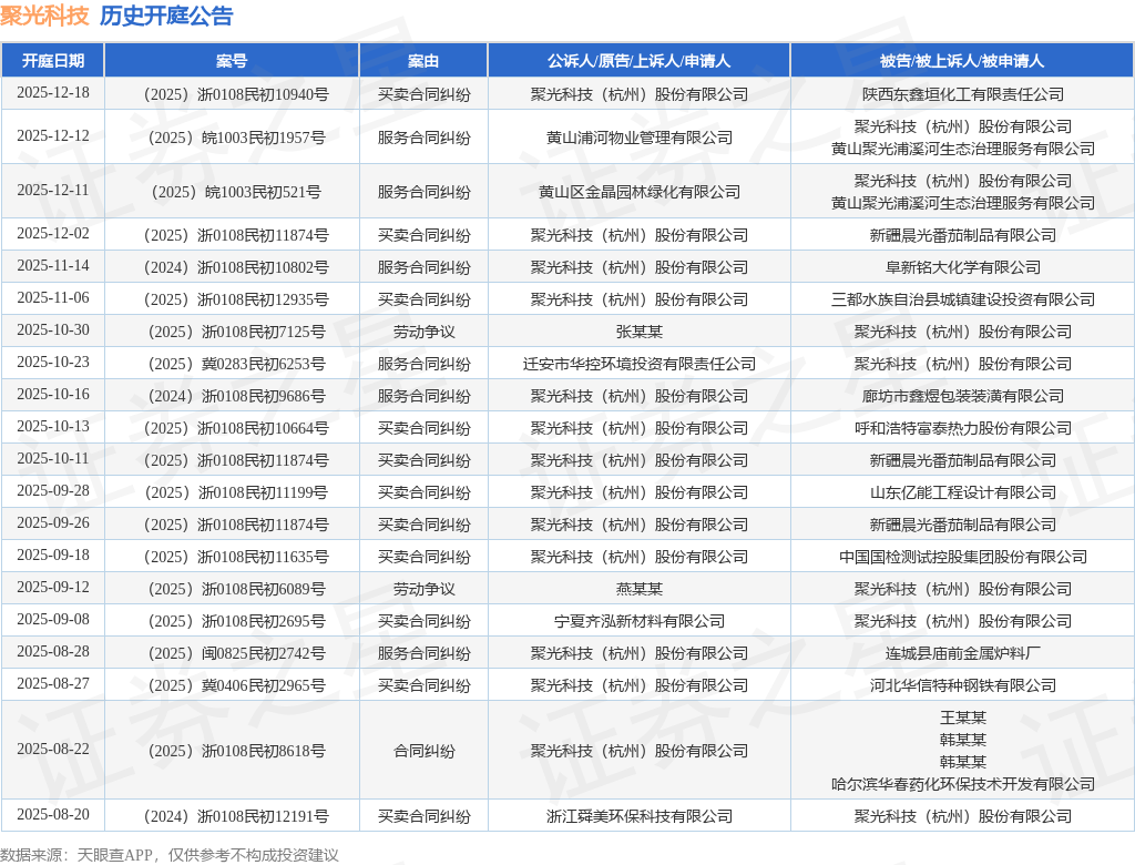 案号:(2025)浙0108民初10940号根据统计,近一年内以聚光科技(杭州)股份有限公司为当事人的历史开庭公告有53则,其中案由为“买卖合同纠纷”的公告以26则居首,其次为“服务合同纠纷”有18则,“合同纠纷”有5则。历史开庭公告(前20条)如下: