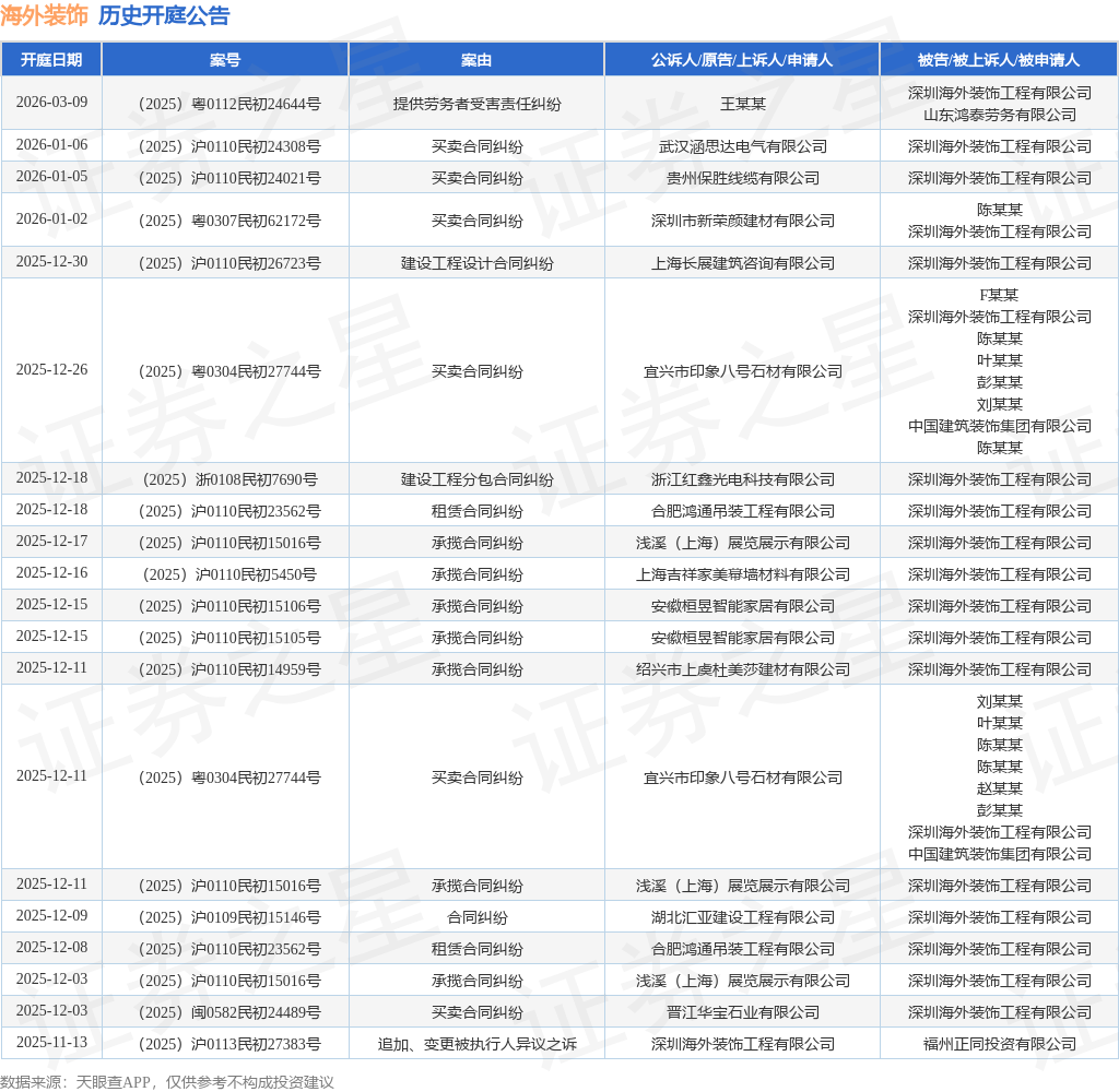 案号:(2025)浙0108民初7690号根据统计,近一年内以深圳海外装饰工程有限公司为当事人的历史开庭公告有104则,其中案由为“买卖合同纠纷”的公告以47则居首,其次为“承揽合同纠纷”有21则,“建设工程分包合同纠纷”有14则。历史开庭公告(前20条)如下: