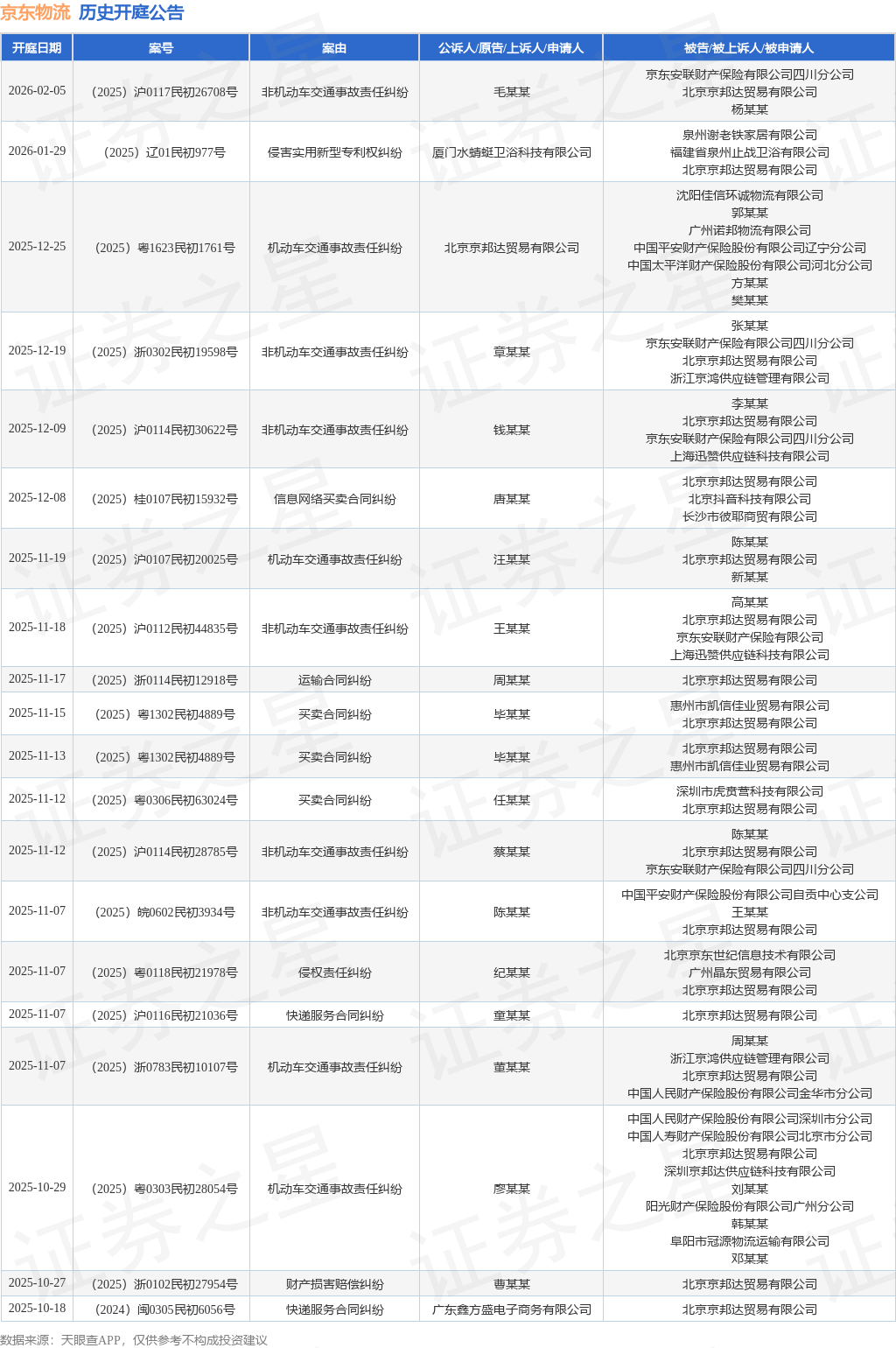 案号:(2025)浙0302民初19598号根据统计,近一年内以北京京邦达贸易有限公司为当事人的历史开庭公告有118则,其中案由为“运输合同纠纷”的公告以20则居首,其次为“快递服务合同纠纷”有17则,“机动车交通事故责任纠纷”有17则。历史开庭公告(前20条)如下: