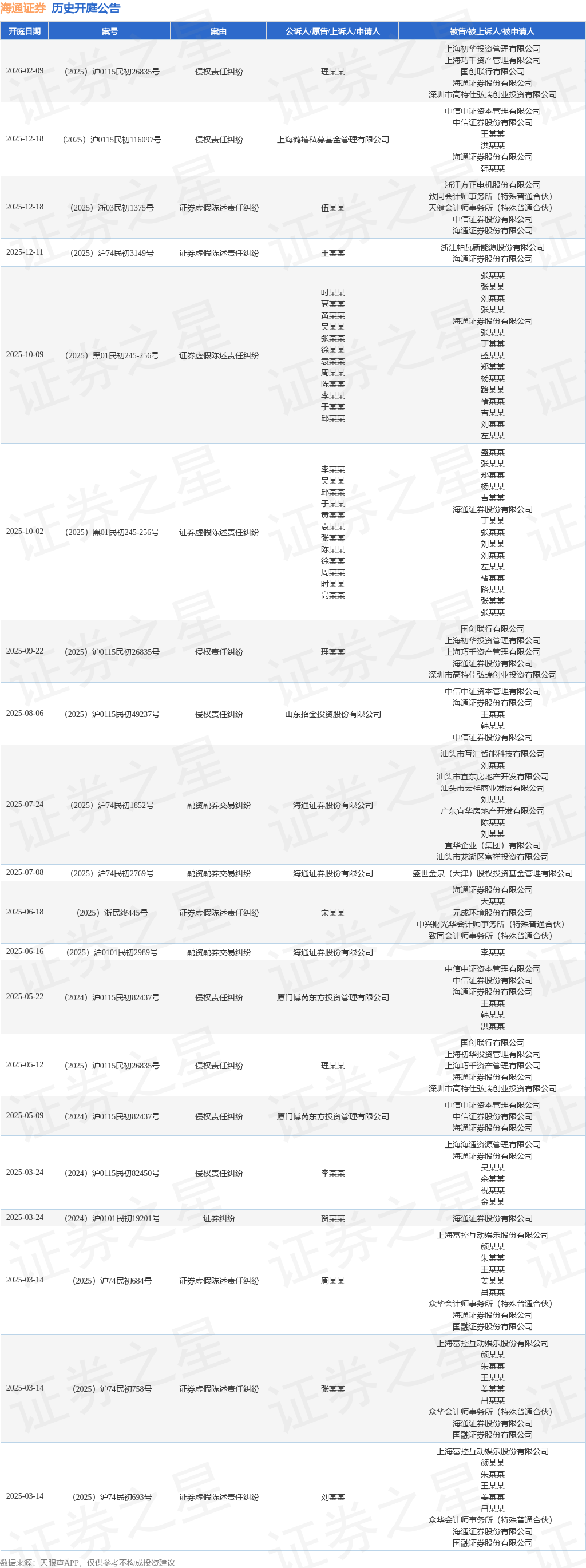 案号:(2025)浙03民初1375号根据统计,近一年内以海通证券股份有限公司为当事人的历史开庭公告有24则,其中案由为“侵权责任纠纷”的公告以10则居首,其次为“证券虚假陈述责任纠纷”有9则,“融资融券交易纠纷”有4则。历史开庭公告(前20条)如下: