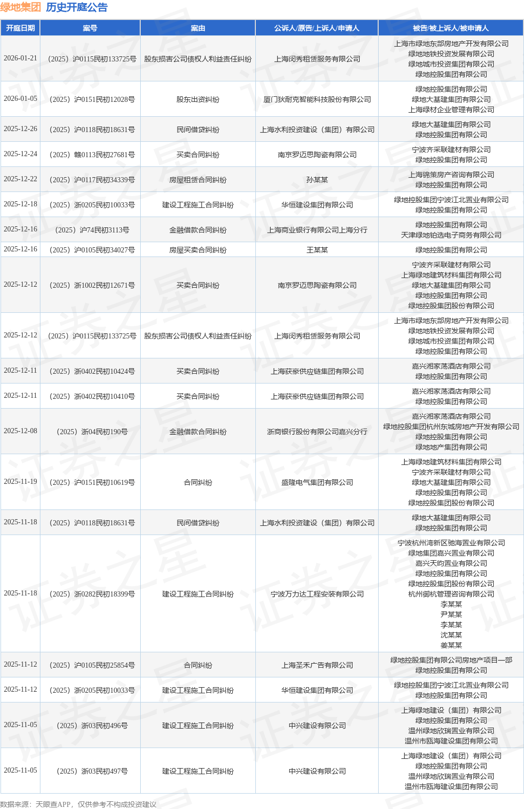 案号:(2025)浙0205民初10033号根据统计,近一年内以绿地控股集团有限公司为当事人的历史开庭公告有200则,其中案由为“建设工程施工合同纠纷”的公告以38则居首,其次为“金融借款合同纠纷”有25则,“合同纠纷”有18则。历史开庭公告(前20条)如下: