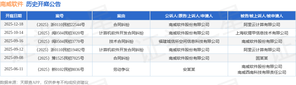 根据统计,近一年内以南威软件股份有限公司为当事人的历史开庭公告有6则,其中案由为“合同纠纷”的公告以2则居首,其次为“计算机软件开发合同纠纷”有2则,“劳动争议”有1则。历史开庭公告如下:
