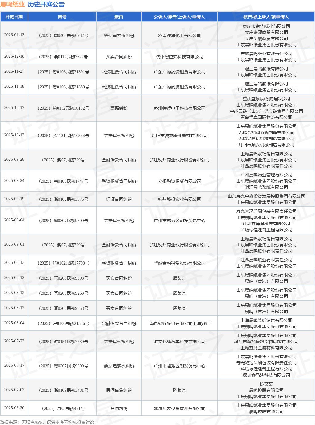 案号:(2025)浙0112民初7622号根据统计,近一年内以山东晨鸣纸业集团股份有限公司为当事人的历史开庭公告有79则,其中案由为“票据追索权纠纷”的公告以21则居首,其次为“融资租赁合同纠纷”有17则,“买卖合同纠纷”有12则。历史开庭公告(前20条)如下: