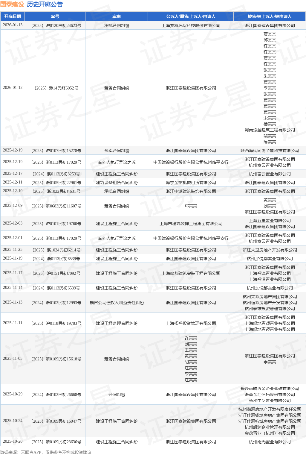 案号:(2025)浙0113民初17029号根据统计,近一年内以浙江国泰建设集团有限公司为当事人的历史开庭公告有151则,其中案由为“建设工程施工合同纠纷”的公告以48则居首,其次为“买卖合同纠纷”有24则,“建设工程分包合同纠纷”有18则。历史开庭公告(前20条)如下: