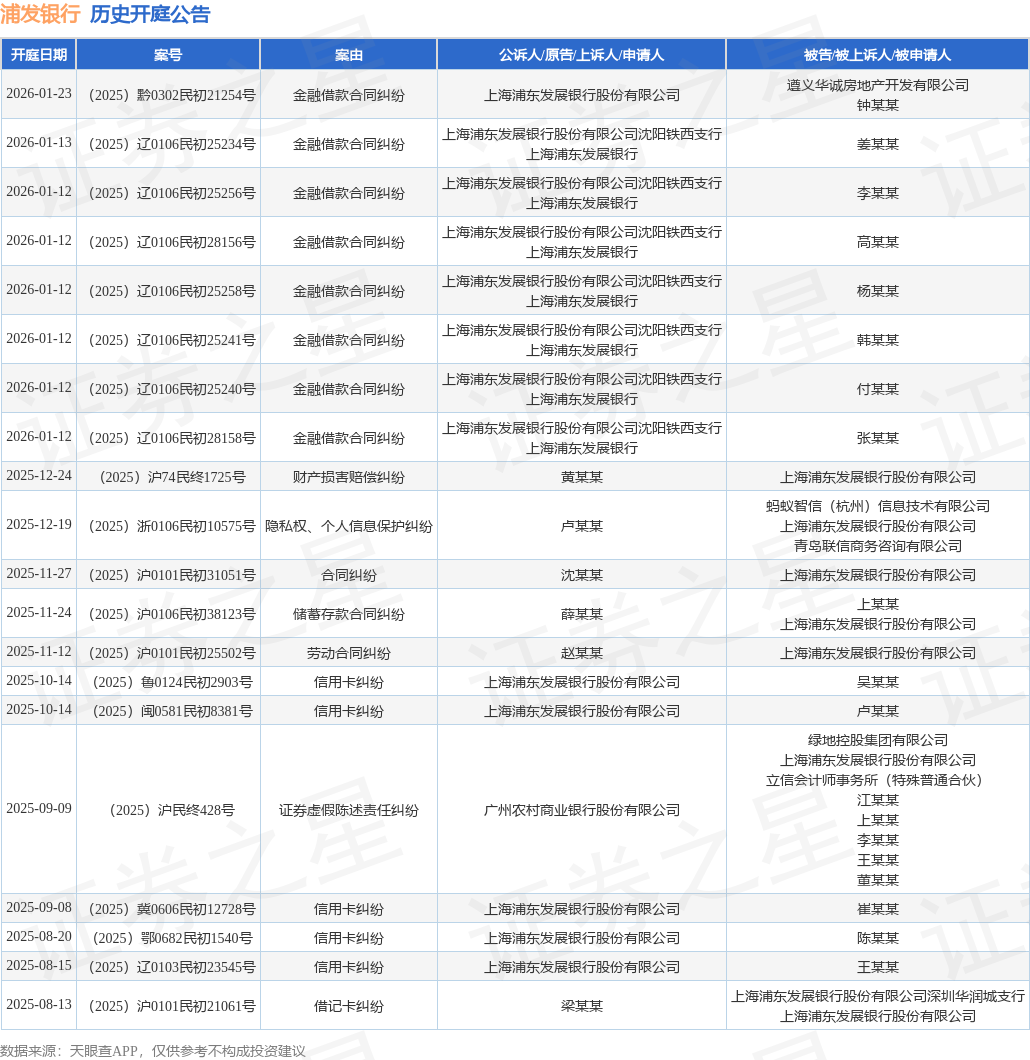 案号:(2025)浙0106民初10575号根据统计,近一年内以上海浦东发展银行股份有限公司为当事人的历史开庭公告有53则,其中案由为“金融借款合同纠纷”的公告以20则居首,其次为“信用卡纠纷”有9则,“证券虚假陈述责任纠纷”有4则。历史开庭公告(前20条)如下: