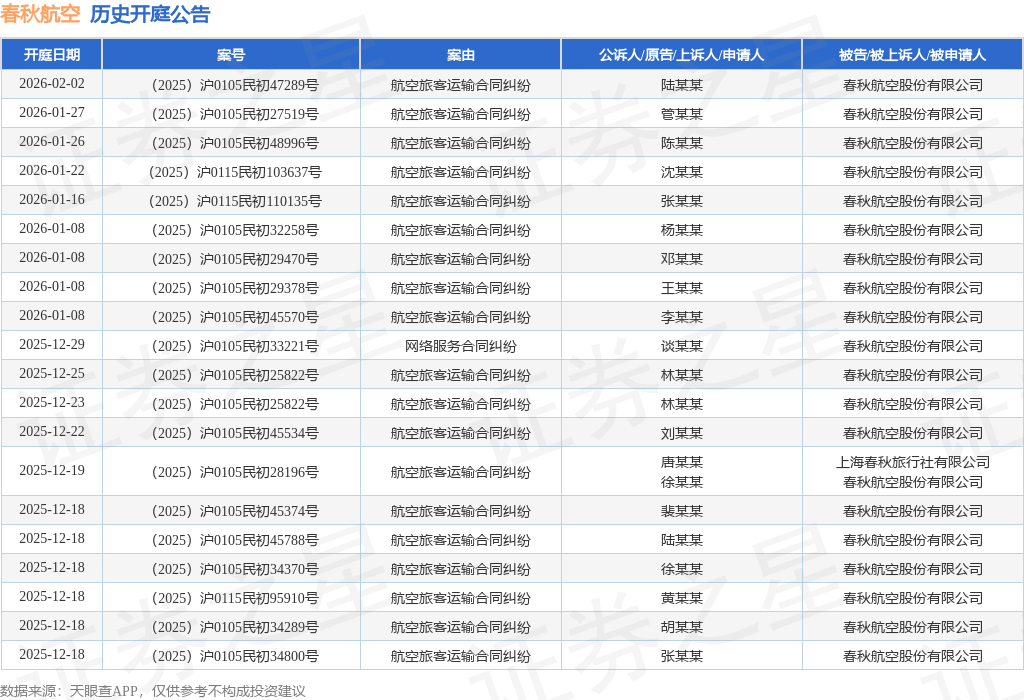 案号:(2025)沪0105民初28196号根据统计,近一年内以春秋航空股份有限公司为当事人的历史开庭公告有130则,其中案由为“航空旅客运输合同纠纷”的公告以92则居首,其次为“网络服务合同纠纷”有13则,“劳动合同纠纷”有11则。历史开庭公告(前20条)如下: