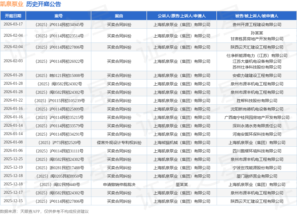 案号:(2025)浙0281民初17488号根据统计,近一年内以上海凯泉泵业(集团)有限公司为当事人的历史开庭公告有248则,其中案由为“买卖合同纠纷”的公告以206则居首,其次为“合同纠纷”有7则,“分期付款买卖合同纠纷”有6则。历史开庭公告(前20条)如下: