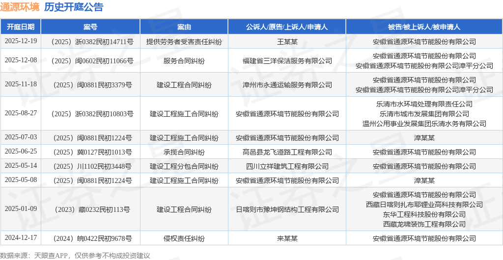 案号:(2025)浙0382民初14711号根据统计,近一年内以安徽省通源环境节能股份有限公司为当事人的历史开庭公告有10则,其中案由为“建设工程施工合同纠纷”的公告以3则居首,其次为“建设工程合同纠纷”有2则,“侵权责任纠纷”有1则。历史开庭公告如下: