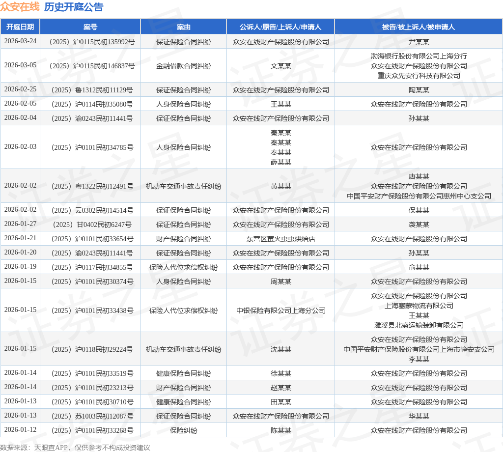 案号:(2025)浙0803民初4180号根据统计,近一年内以众安在线财产保险股份有限公司为当事人的历史开庭公告有4586则,其中案由为“保证保险合同纠纷”的公告以2971则居首,其次为“人身保险合同纠纷”有629则,“保险人代位求偿权纠纷”有289则。历史开庭公告(前20条)如下: