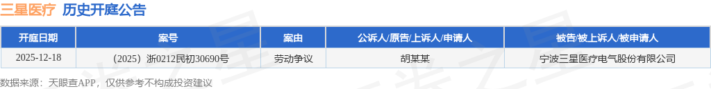 根据统计,近一年内以宁波三星医疗电气股份有限公司为当事人的历史开庭公告有1则,其中案由为“劳动争议”的公告以1则居首。历史开庭公告如下: