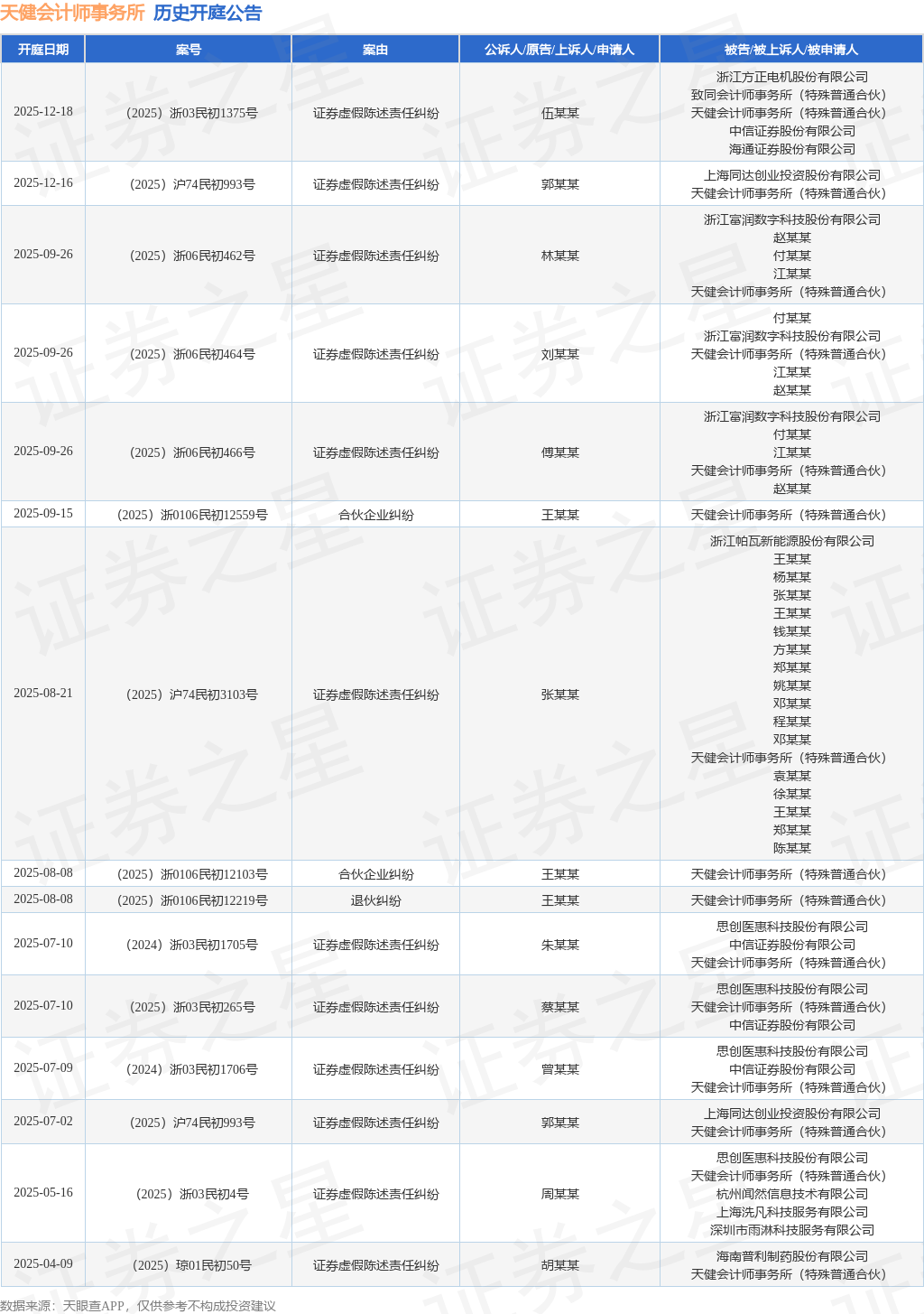 案号:(2025)浙03民初1375号根据统计,近一年内以天健会计师事务所(特殊普通合伙)为当事人的历史开庭公告有15则,其中案由为“证券虚假陈述责任纠纷”的公告以12则居首,其次为“合伙企业纠纷”有2则,“退伙纠纷”有1则。历史开庭公告如下: