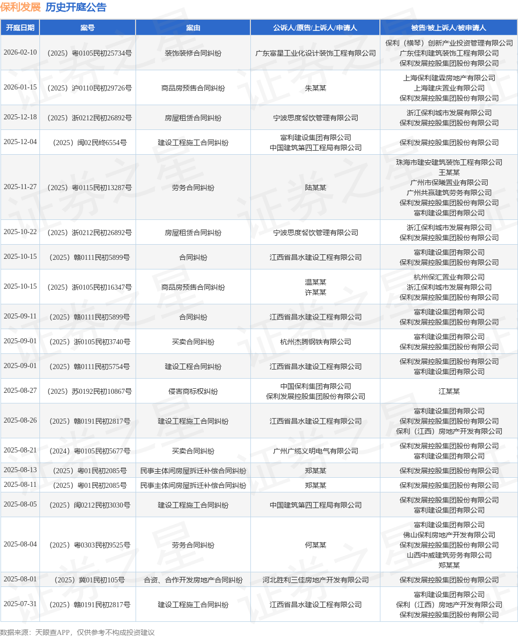 案号:(2025)浙0212民初26892号根据统计,近一年内以保利发展控股集团股份有限公司为当事人的历史开庭公告有84则,其中案由为“买卖合同纠纷”的公告以17则居首,其次为“建设工程施工合同纠纷”有12则,“建设工程合同纠纷”有9则。历史开庭公告(前20条)如下: