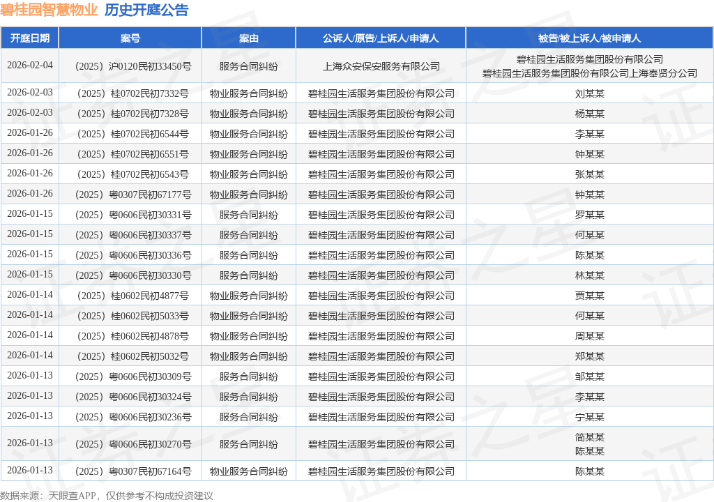 案号:(2025)浙0106民初5211号根据统计,近一年内以碧桂园生活服务集团股份有限公司为当事人的历史开庭公告有41则,其中案由为“物业服务合同纠纷”的公告以22则居首,其次为“服务合同纠纷”有14则,“合同纠纷”有2则。历史开庭公告(前20条)如下: