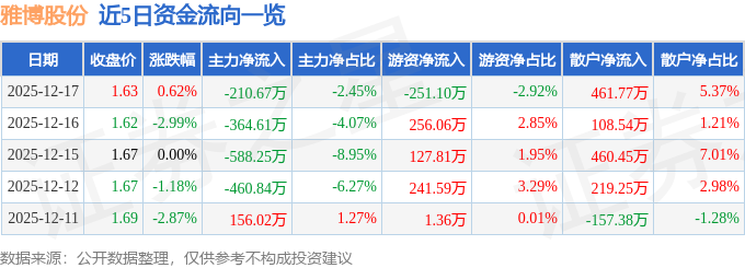 证券之星消息,截至2025年12月17日收盘,雅博股份(002323)报收于1.63元,上涨0.62%,换手率2.54%,成交量53.78万手,成交额8607.09万元。