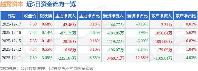 证券之星消息,截至2025年12月17日收盘,越秀资本(000987)报收于7.39元,上涨0.68%,换手率0.63%,成交量31.68万手,成交额2.33亿元。