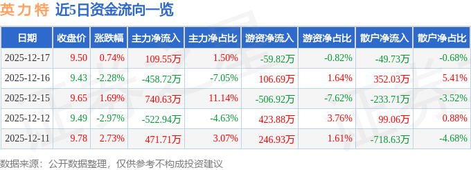 12月17日的资金流向数据方面,主力资金净流入109.55万元,占总成交额1.5%,游资资金净流出59.82万元,占总成交额0.82%,散户资金净流出49.73万元,占总成交额0.68%。