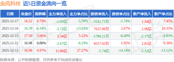 证券之星消息,截至2025年12月17日收盘,金风科技(002202)报收于16.52元,上涨0.79%,换手率3.29%,成交量110.19万手,成交额18.02亿元。