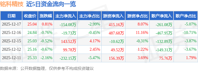 证券之星消息,截至2025年12月17日收盘,铭科精技(001319)报收于25.04元,上涨0.81%,换手率2.53%,成交量2.07万手,成交额5144.48万元。