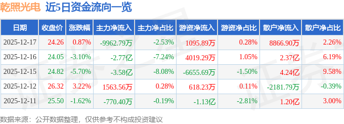证券之星消息,截至2025年12月17日收盘,乾照光电(300102)报收于24.26元,上涨0.87%,换手率17.61%,成交量161.36万手,成交额39.32亿元。