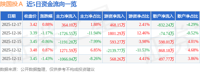 证券之星消息,截至2025年12月17日收盘,陕国投A(000563)报收于3.42元,上涨0.88%,换手率1.12%,成交量57.25万手,成交额1.94亿元。