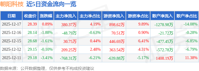 证券之星消息,截至2025年12月17日收盘,朝阳科技(002981)报收于28.39元,上涨0.89%,换手率2.71%,成交量3.24万手,成交额9084.23万元。
