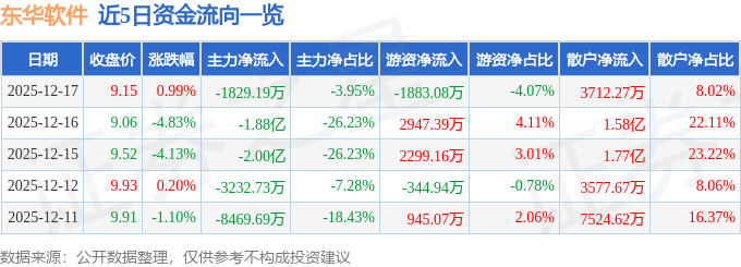 证券之星消息,截至2025年12月17日收盘,东华软件(002065)报收于9.15元,上涨0.99%,换手率1.76%,成交量51.06万手,成交额4.63亿元。